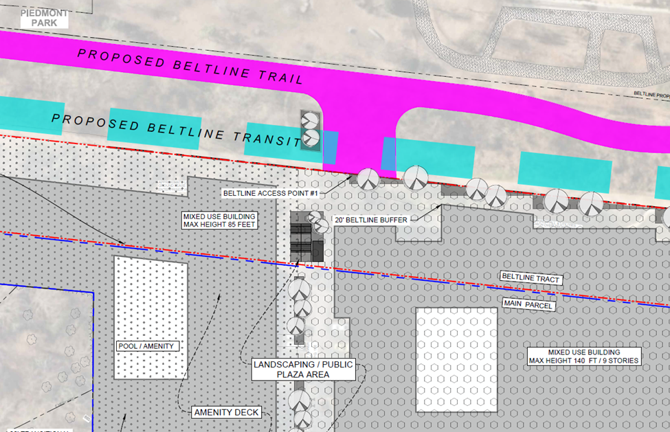 Screen capture of Portman Holding’s site design for Amsterdam Walk, including the minor concession for Beltline light rail. If they advocated for light rail as hard as they are advocating for parking, Beltline Rail Now would support this project. Image credit: Portman Holdings.